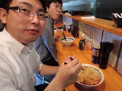 終盤に入ったせいで遠い目をしている横で、編集長・吉田の唇は赤く光る。食べ進むほどにスープも麺も赤みが増していく感がある。