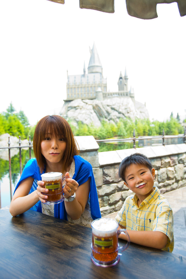 名物の「バタービール」は子どもでも安心して飲めるノンアルコールなので、泡で口ひげを作ってみたり、映画のワンシーンを再現して楽しんで下さい。