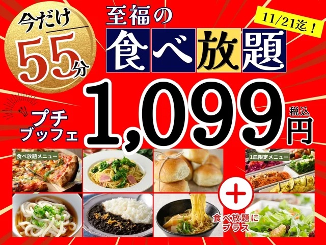 「ニラックスブッフェ」では、45分間で楽しめる「プチブッフェ」を、10分延長して55分間のコースとして提供するキャンペーンが11月21日(木)まで開催!このコースは「税込1099円」というリーズナブルな価格で、気軽に豊富なメニューを楽しめる点が魅力です。