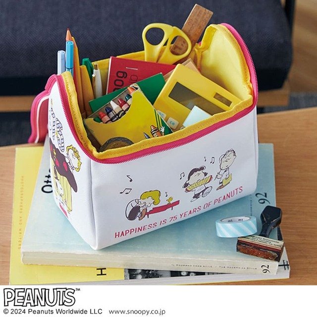 真っ赤な屋根でおなじみの、スヌーピーのドッグハウスをモチーフにした収納ポーチ。スヌーピーと仲間たちが音楽を演奏したり仲良く過ごすシーンがプリントされています。