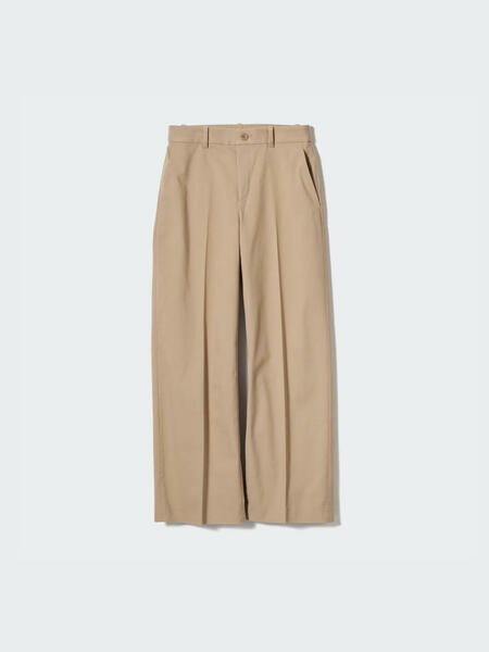 担当者「チノパンツには珍しいワイドシルエットが可愛い新商品。履き心地なめらかで簡単にスタイルアップができます。中央のタックで足長効果が狙えるのがポイントです」