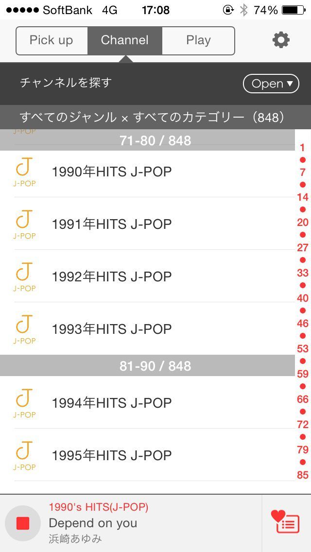 例えばアラサーの自分が「久々に90年代のJ-POPを聴きたいなあ~」と思ってチャンネルを探すと、90年代でひとくくりではなく、1991年のヒット曲、1992年のヒット曲……と、1年刻みでチャンネルが用意されている充実っぷりなのです。