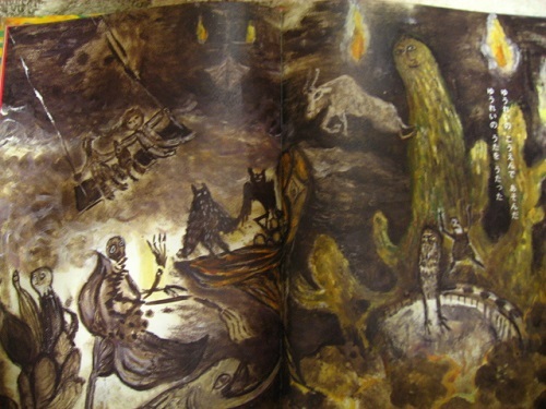 また、小さい女の子「マイマイ」が自分の壊れた右目に弟の「ナイナイ」をいれて、不思議な世界を体験するという、美しくも不気味な物語『マイマイとナイナイ』(皆川博子/作 宇野亜喜良/絵)や、街中至る所におばけがはさまっていて、「痛い痛い」とおばけたちがあちこちで泣き叫ぶ様子が描かれている『ちょうつがい きいきい』(加門七海/作 軽部武宏/絵)も、内容はもちろん、絵のインパクトが印象的で、一度読むと決して忘れられない絵本です。