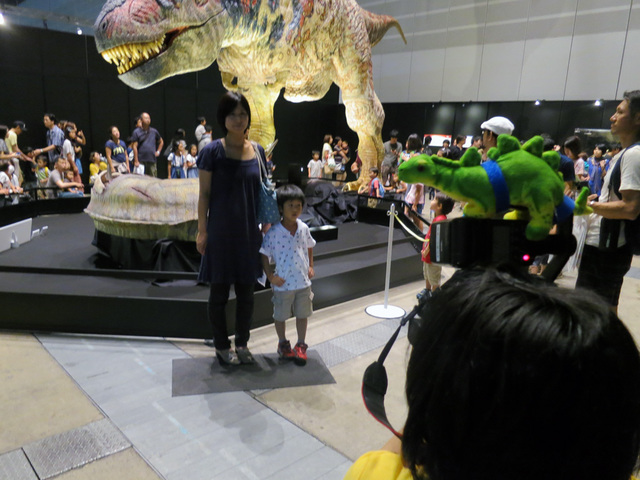 「ティラノサウルスの実物大ロボット」前では、スタッフの方がお手持ちのカメラ1台で記念写真を撮影してくれるサービスも!