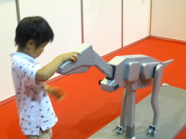 しかし息子のテンションが一番上がったのはこちらでした! ティラノサウルスの実物大ロボット! これを目にした途端、展示の最前列へ駆け寄って大興奮!
