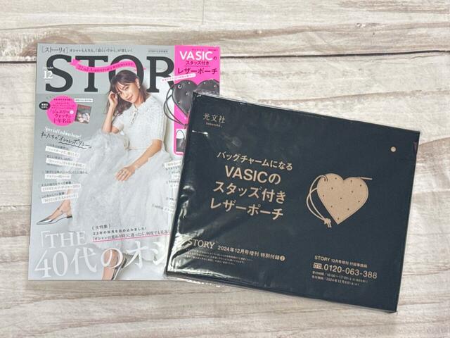 光文社から2024年11月1日(金)に発売された『STORY(ストーリィ)』12月号増刊には、スタッズが高級感たっぷりな『VASIC(ヴァジック)』のスタッズ付きレザーポーチが付録としてついてきます。