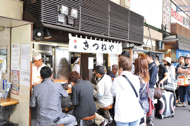 店の前を通りかかると八丁味噌のいい香りが漂ってくる。「きつねや」のホルモン煮は店主の祖父が考案し、代々伝えられてきた味。八丁味噌をベースにじっくり煮込んだ牛ホルモンをご飯にかけた「ホルモン丼」は、昼時になると他店の前にまで行列ができる人気メニューだ。