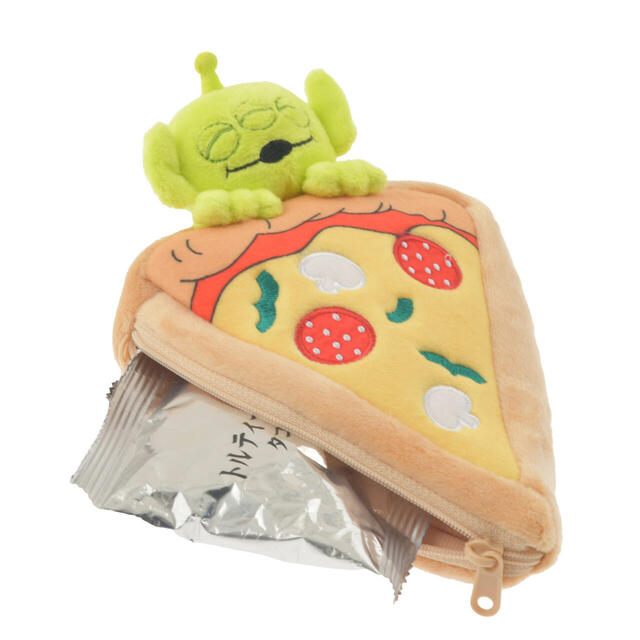 カットされたピザに、リトルグリーンメンが笑顔でかじりついている、キュートなデザインのポーチです。
