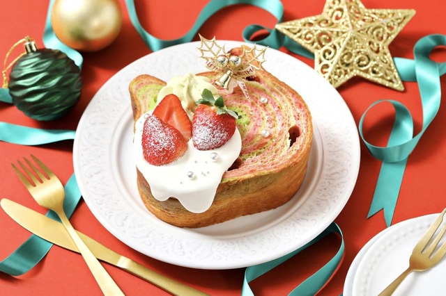 コラボ限定の新フレーバー「ねこねこ食パン ホリデイサンタ」のパン生地には、プレーンとピスタチオ、いちごの三色を使用。断面がクリスマスカラーのぐるぐる模様で、とってもかわいいんです。