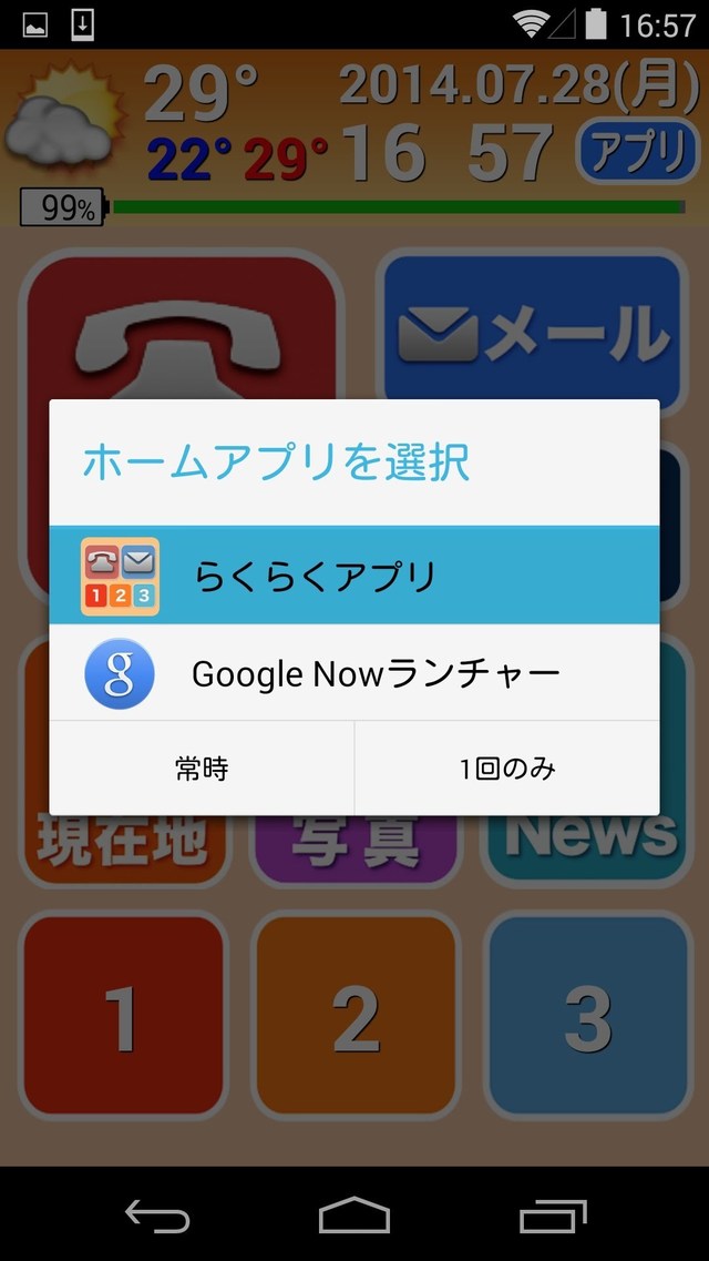 重要な設定として、らくらくアプリをホームアプリの標準として設定しておくことが必要になります。ホームボタンを押した時に表示するホームアプリを問われるので、「らくらくアプリ」を選択して「常時」をタップしましょう。これで、らくらくアプリが基本のホームアプリに設定されます。
