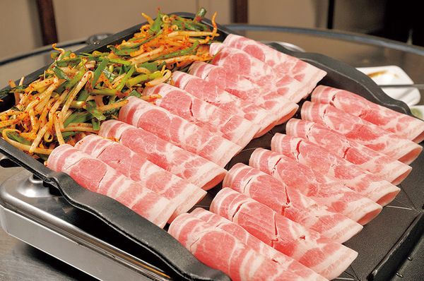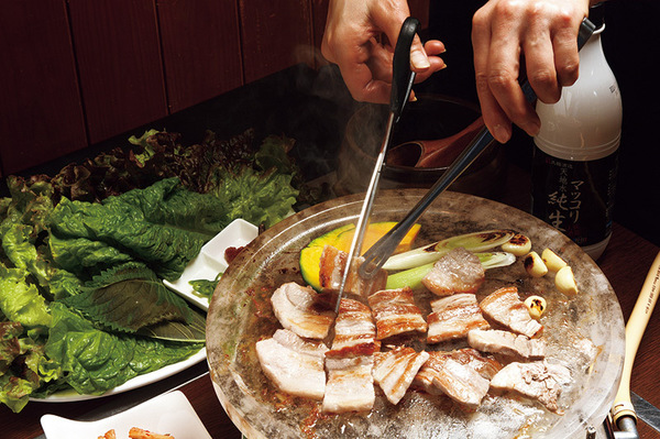銘柄豚を使ったサムギョプサルの専門店で、店内は韓国の屋台風の雰囲気。水晶板で焼いたサムギョプサルは柔らかくてジューシーな味。なかでもおすすめは、薄切り肉を使った「味付けカンナサムギョプサル」だ。焼き上がったら、キムチやもやしと一緒にいただこう。