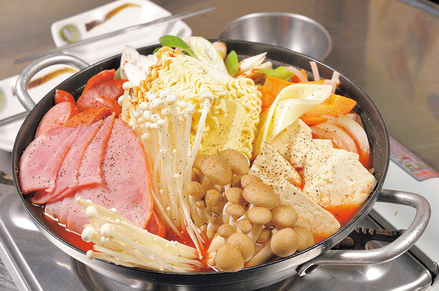 ブデチゲ(中) 2280円 唐辛子やニンニク入りのピリ辛スープにソーセージやハム、野菜に麺などが入り、ボリューム満点。 拡大画像表示
