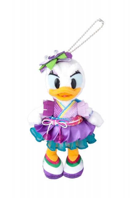 紫を基調にした和装姿のデイジーぬいぐるみバッジ。