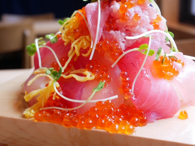 タワー型に生ビンチョウマグロ、生キハダマグロ、マグロたたき、中トロを積み上げてご飯を覆いつくし、こぼれるほどのウニやイクラをちりばめた一皿は、見た目にも迫力満点です。