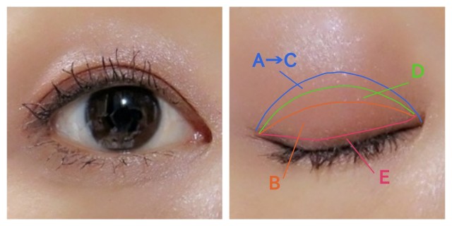 ハイライトカラー(A)をアイホールに乗せた後、ベージュ系(D)、赤みブラウン(B)、濃いブラウン(E)の順でグラデーションを作りましょう。最後にピンクラメ(C)をまぶた中央部分に重ねて出来上がりです。