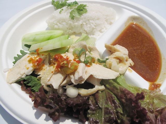 続いてタイ『フエン タイ』さんでは、話題の「カオマンガイ」をいただきました。カオマンガイとは、茹で鳥をその茹で汁で炊いたご飯とともに食べる料理。野菜もたっぷりで、ヘルシーながら鳥肉のおいしさを存分に味わえるメニューです。