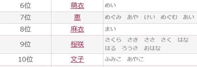 6位から10位には「桜咲 」ちゃん、「麻衣」ちゃん、「萌衣」ちゃんなど、自然に関する漢字を使った名前がランクイン。
