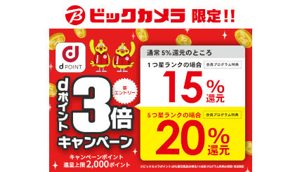 同キャンペーンでは、期間中にキャンペーンサイトにてエントリーした上で、「ビックカメラ」店舗にてdポイントカードなどを提示して1ポイント以上貯めると、最大15%分のdポイントが還元される。