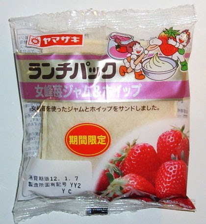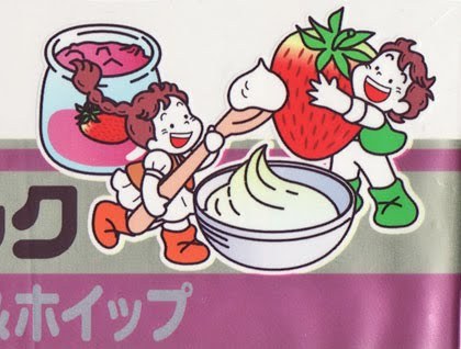 ランチパックと言えばパッケージのかわいいイラスト。味ごとに色んなバリエーションがあります。「女峰苺ジャム&ホイップ」の方では大きな苺を抱えた男の子とホイップをすくう女の子。背後にはジャムびんまで置いてあり、そこにまた苺の絵が。誤解のしようがない演出です。