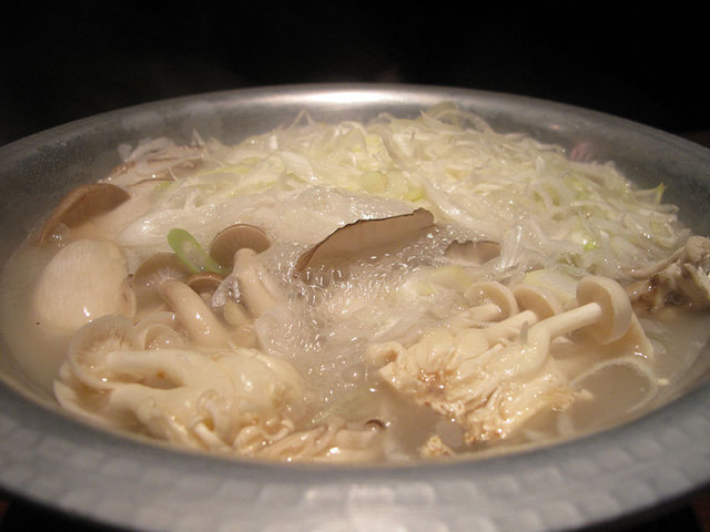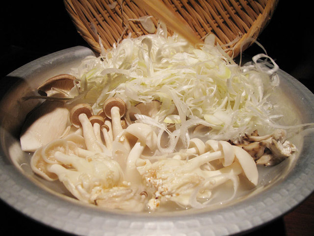最初に、鍋に豚の膝周り(げんこつ)からとって作った、ぷるぷるの自家製コラーゲンが入った鍋が運ばれてきました。これは美肌になれそう! 少し火を通しコラーゲンが溶けた中に、4種類のきのこと白葱をすべて鍋に投入します。