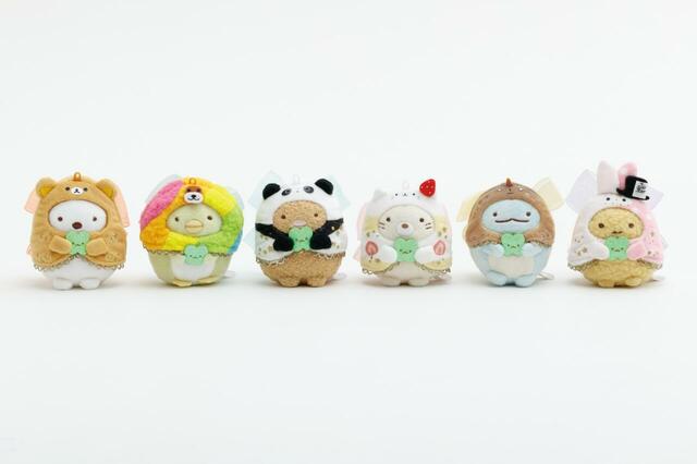 すみっコぐらしの6キャラクターが、リラックマやたれぱんだたちになりきった、可愛らしいぬいぐるみ。