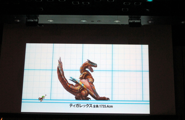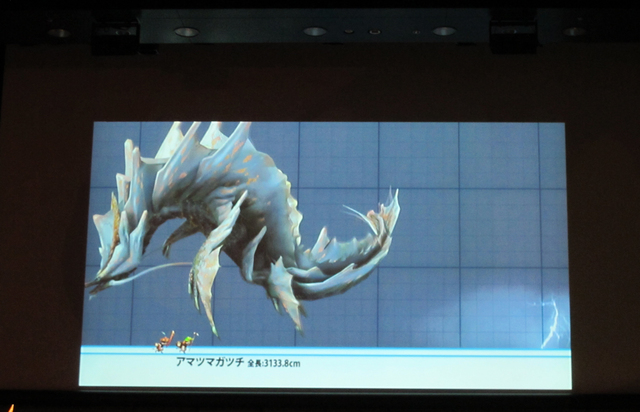 「モンハン」10年の歴史を振り返ったハンターたちが、たどりつくのがここ。ひときわ天井の高い大きな空間に鎮座するのが、10月11日(土)発売のシリーズ最新作『モンスターハンター4G』のメインモンスター・セルレギオス様です。
