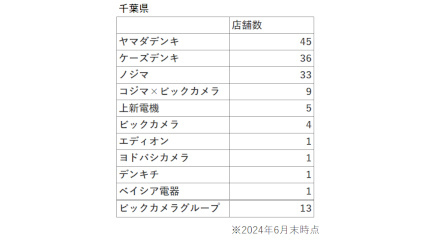 チェーン店舗別でみると、1位はヤマダデンキ、2位はケーズデンキ、3位はノジマ。4位は「コジマ×ビックカメラ」と「ビックカメラ」をあわせたビックカメラグループ、5位は上新電機だった。他にエディオン、ヨドバシカメラ、でんきち(デンキチ)、ベイシア電器が各1店舗ずつあるが、上位2社が大きくリードしている状況だ。なお、本連載で用いる集計データは、家電量販店各社のウェブサイトに2024年6月末時点で記載されていたデータをもとにし、7月以降の新規開店・閉店は反映していない。今年10月11日に、大型スーパー「ベイシア」のインショップとしてオープンした「ベイシア電器市原八幡店」を含めると、ベイシア電器はデンキチを超える2店舗となる。