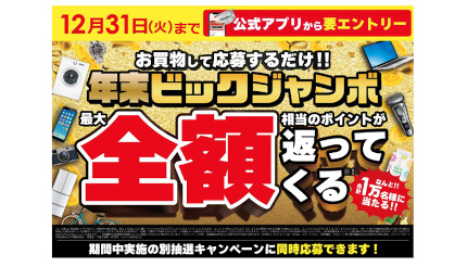 ビックカメラは11月25日~12月31日23時59分の期間、税込1万円以上購入して、キャンペーンに応募することによって、抽選で購入金額の最大金額(上限10万円相当)のポイントが還ってくる「年末ビックジャンボ」を開催する。
