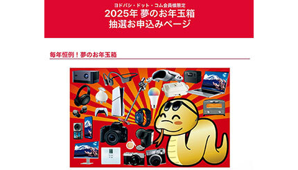 ヨドバシカメラは11月25日11時から、ECサイト「ヨドバシ・ドット・コム」で毎年恒例の福袋企画「ヨドバシ・ドット・コム会員限定 2025年 夢のお年玉箱」の抽選申し込みの受け付けを開始した。期間は12月1日23時59分まで。抽選結果は12月3日9時以降、順次発表する。