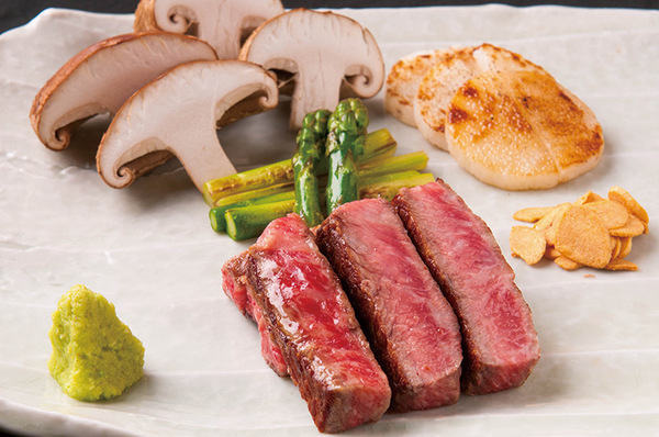 リブロース芯ステーキ(約100g) 4000円(税別) 山形牛A5の雌牛のなかでも特に希少なリブロース芯を使用。きめが細かく、豊かな風味が口に広がる。