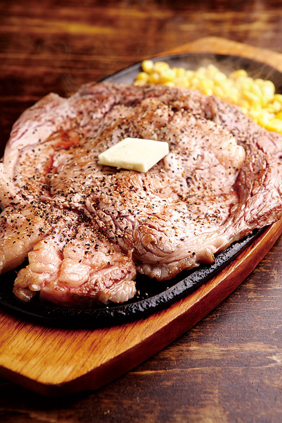 1ポンドリブロースステーキ(ライス付) 3348円 肉質は実にきめ細やか。凝縮されたうま味の中に甘味も感じられるその味わいに、女性リピーターも多い。 拡大画像表示