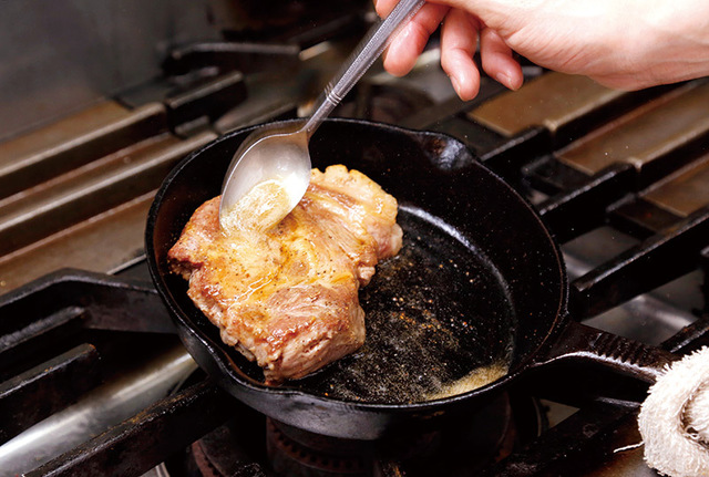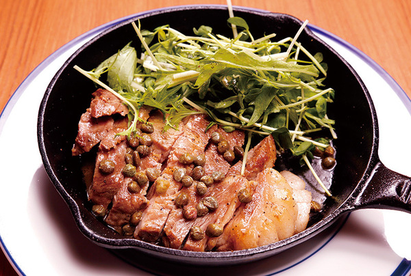 豚テキ! もち豚肩ロースステーキ フレンチケッパーソース(250g) 1680円(税別) 中はうっすらピンク色に焼き上げたジューシーな肩ロースを上品な風味のソースでいただく看板メニュー。