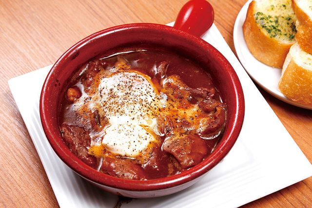 豚もつ赤ワイン煮込み 半熟玉子添え 680円(税別) 味噌が隠し味。ガーリックトースト(400円・税別)と一緒に食べるのがおすすめだ。 拡大画像表示