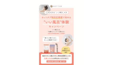 そのほか、「特別定期便」購入者限定特典として、「HOT TAB」の使用体験談を、ハッシュタグ「#ホッタブ」を付けてSNSに投稿した人の中から、抽選で5組10名を大分県長湯温泉「クアパーク長湯」(大分県竹田市)に招待する。