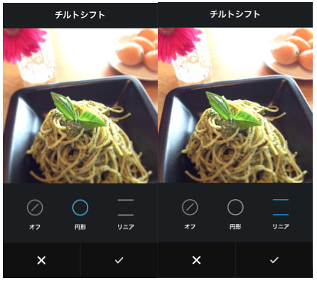 ★チルトシフト……写真のぼかしの効果を楽しめる機能。写真下の「円形」を選ぶと、中央以外の部分にぼかし効果が加わり、「リニア」を選ぶと、中央の帯以外の上下部分にぼかし効果が加わります。バックをぼかしたい時に使ってみましょう。