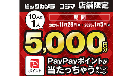 ビックカメラグループのビックカメラとコジマは11月29日~2025年1月5日の期間、店舗限定でコード決済を使って1000円以上購入すると、抽選で10人に1人、5000円分のPayPayポイントが当たる「PayPayポイントが当たっちゃうキャンペーン」を開催する。