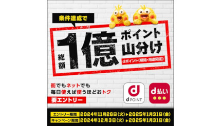 NTTドコモは、「dポイントをためる」「d払いの利用」どちらも対象となる「総額1億ポイント山分けキャンペーン」を12月3日から2025年1月31日まで開催する。エントリーは11月26日から受け付けている。