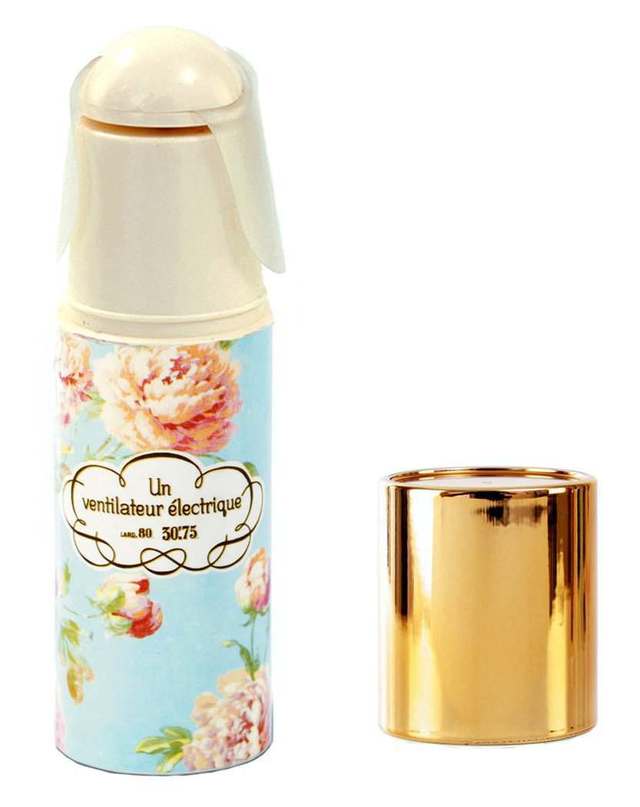 扇風機というより化粧品のようなデザイン。フタを取ると羽根がたたまれています。こんなに女子っぽいデザインのハンディ扇風機は、ほかにあまり見たことがないかも? ほかにもかわいい柄バリエがあるのでお好みのものをチョイスして。
