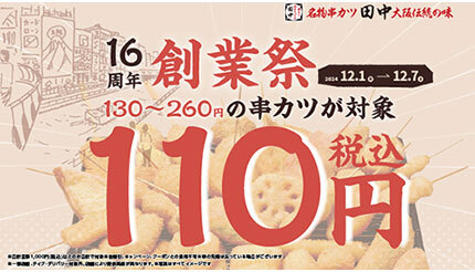 串カツ田中ホールディングスが展開する「串カツ田中」は12月1~7日の7日間、毎年恒例の創業祭を開催する。期間中は通常130~260円以下の串カツ33種類を110円で提供する。