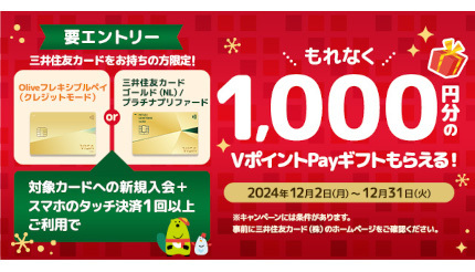 対象カードは、三井住友カード発行のスタンダードカード(口座一体型のカードは除く)。条件は、12月1日時点で対象カードを保有する人がエントリーの上、「Oliveフレキシブルペイ・Oliveフレキシブルペイ ゴールド・Oliveフレキシブルペイ プラチナプリファード(クレジットモード)」または「三井住友カード ゴールド(NL)・三井住友カード プラチナプリファード」に新規入会し、利用期間中に「スマホのタッチ決済」を1回以上利用すること。申込期間は12月2日~12月31日、利用期間は12月2日~2025年1月31日。