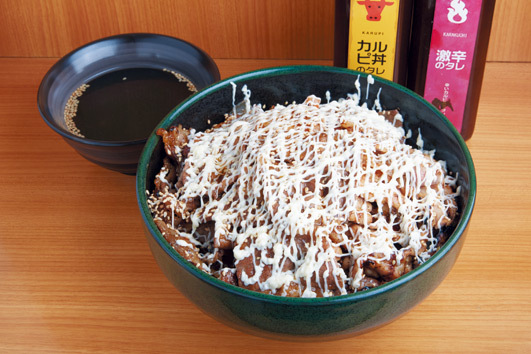 カルピ丼 特盛 900円 特盛サイズなら、ごはんは400gで肉は160g。写真はマヨネーズトッピング(+30円)で930円。 拡大画像表示