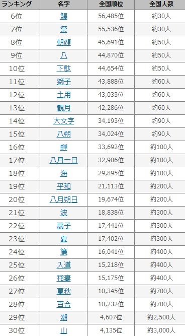 この他にも、夏を連想させる名字はきっとたくさんあるのではないでしょうか。全国に20人や100人しかいない貴重な名字ばかりでしたが、涼やかで素敵な名前がたくさんありました。
