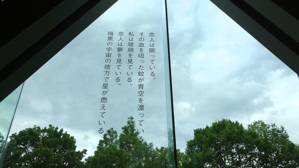通路のガラス壁の隙間に立って見てみると、手前のガラスから奥のガラスへ言葉が繋がっていく、斬新な展示方法の作品も。言葉だけでなくその演出で、どこまでも続いていく宇宙の広がりを感じます。