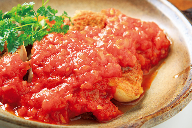 チキンのスパイス焼きトマトソース 945円 素焼きチキンにスパイスをまぶし、トマトソースでいただく一皿。トマトの酸味とスパイシーなチキンが好相性。拡大画像表示