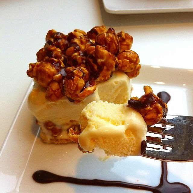 アイスの上にあの濃厚なキャラメルクリスプポップコーンがたっぷりのっていて、チョコレートソースがアクセントになっていますね。