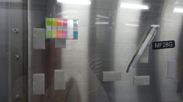 実際は宇宙で過ごしている時は無重力となるので、壁には収納として、マジックテープで小物や研究に必要な物が止められるようになっています。
