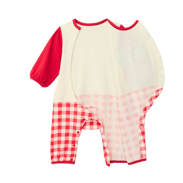 ベビー期独自の脚型にフィットするよう、ひざが外側に開いたボトムスパターンとなっており、ベビーが動きやすく快適に過ごせるところもポイントです。