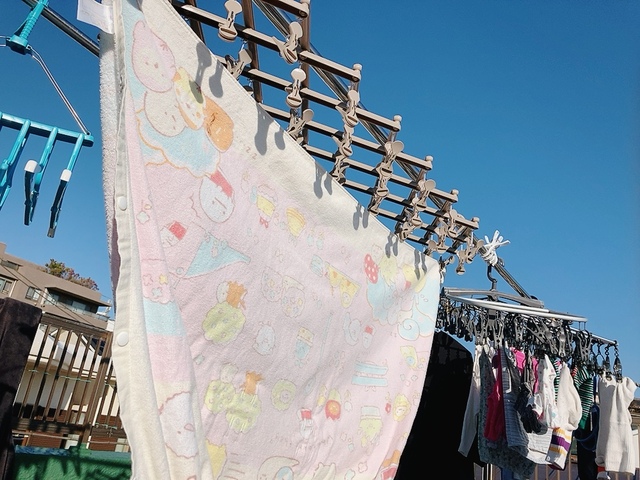 幅を最大に広げて、タオルケットを干してみました。普段はピンチハンガーにギザギザ状に掛けて干していたのですが、この「伸縮式ハンガー」なら両端を2つのピンチで挟むだけでOK。時短になるし、乾きやすいです!