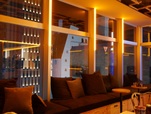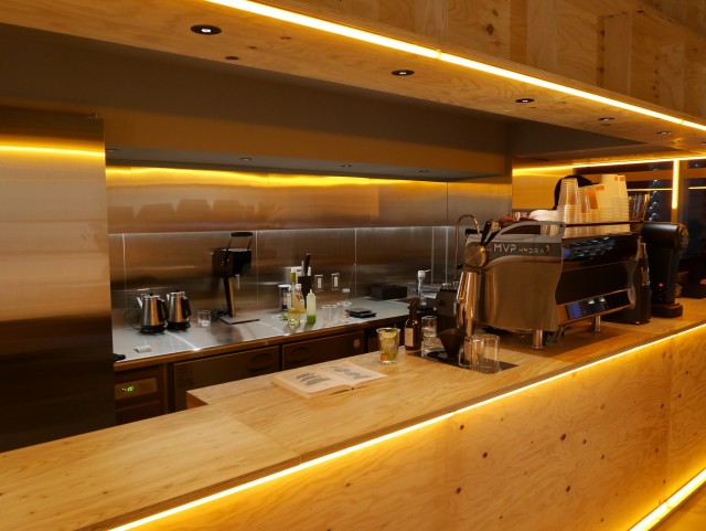 エレベーターが開くと、スタイリッシュなフロントとカフェのキッチンが。