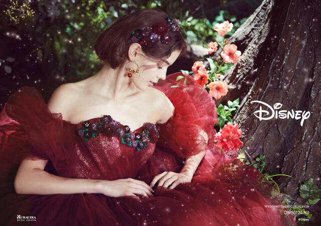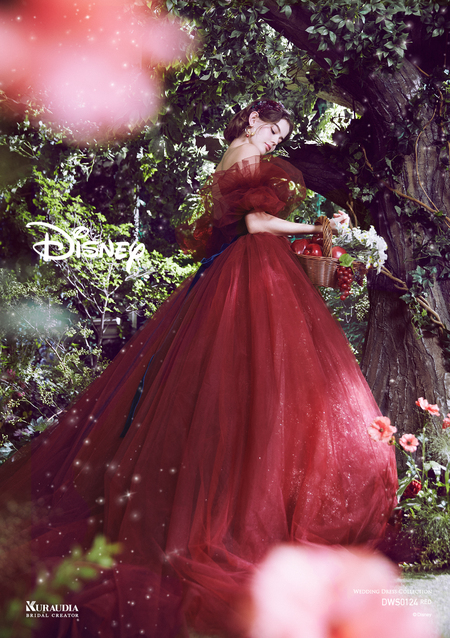 こっくりしたレッドの色味が、大人ロマンティックな雰囲気を引き立てる、白雪姫デザインのドレス。